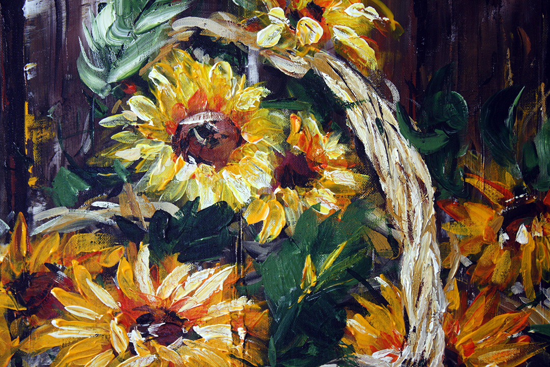 Summer Passion, in a Basket is a bold and cheerful acrylic painting that captures the radiant energy of sunflowers bursting from a woven basket. The artist’s expressive brushstrokes and warm palette bring movement and emotion to the canvas—this is not a still life, but a celebration.